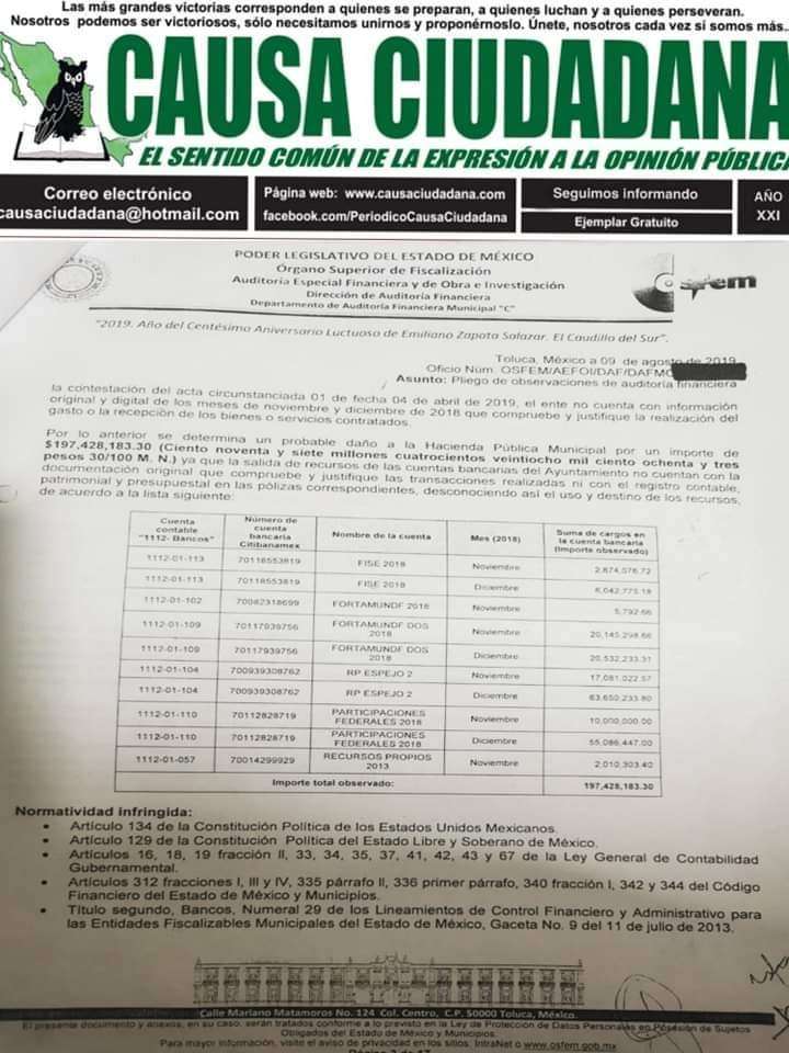 Según el Oficio Núm. OSFEMAEFOUDAFIDAFMI hay una serie de irregularidades y de observaciones dónde a través de una auditoria, existen observaciones de un problema, daño a la administración pública municipal.