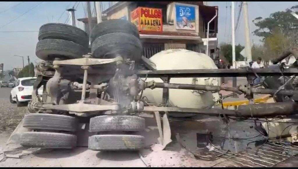 El percance involucró a un camión revolvedor que transportaba concreto para dicha obra, con placas KU-9360-A.