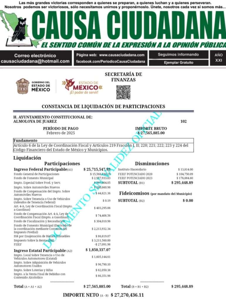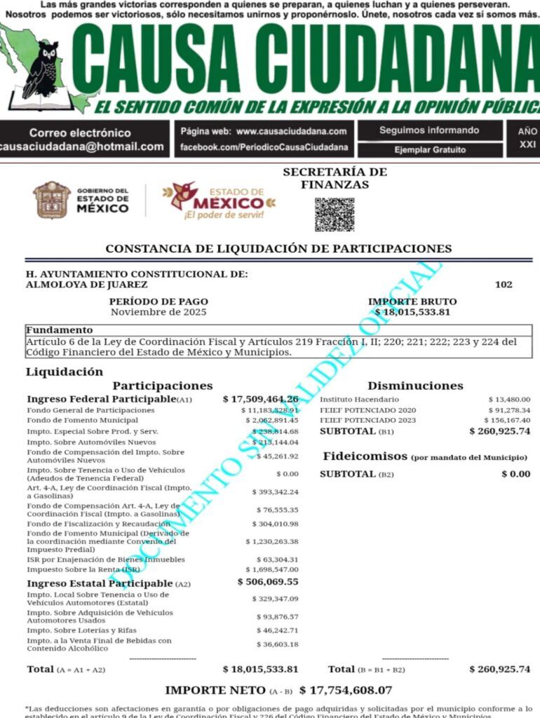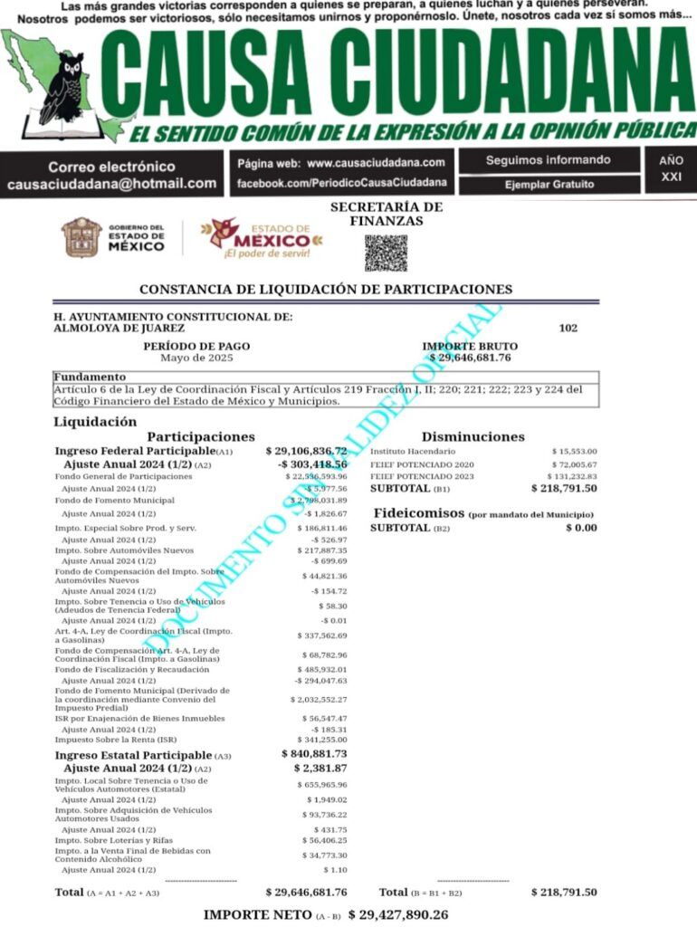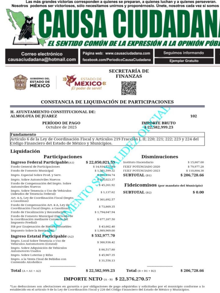 De acuerdo con registros oficiales de transferencias estatales y reportes públicos de finanzas del Estado de México, entre enero y noviembre el Ayuntamiento de Almoloya de Juárez recibió 290 millones 587 mil pesos provenientes del Gobierno del Estado, correspondientes a participaciones, aportaciones y fondos con destino específico.