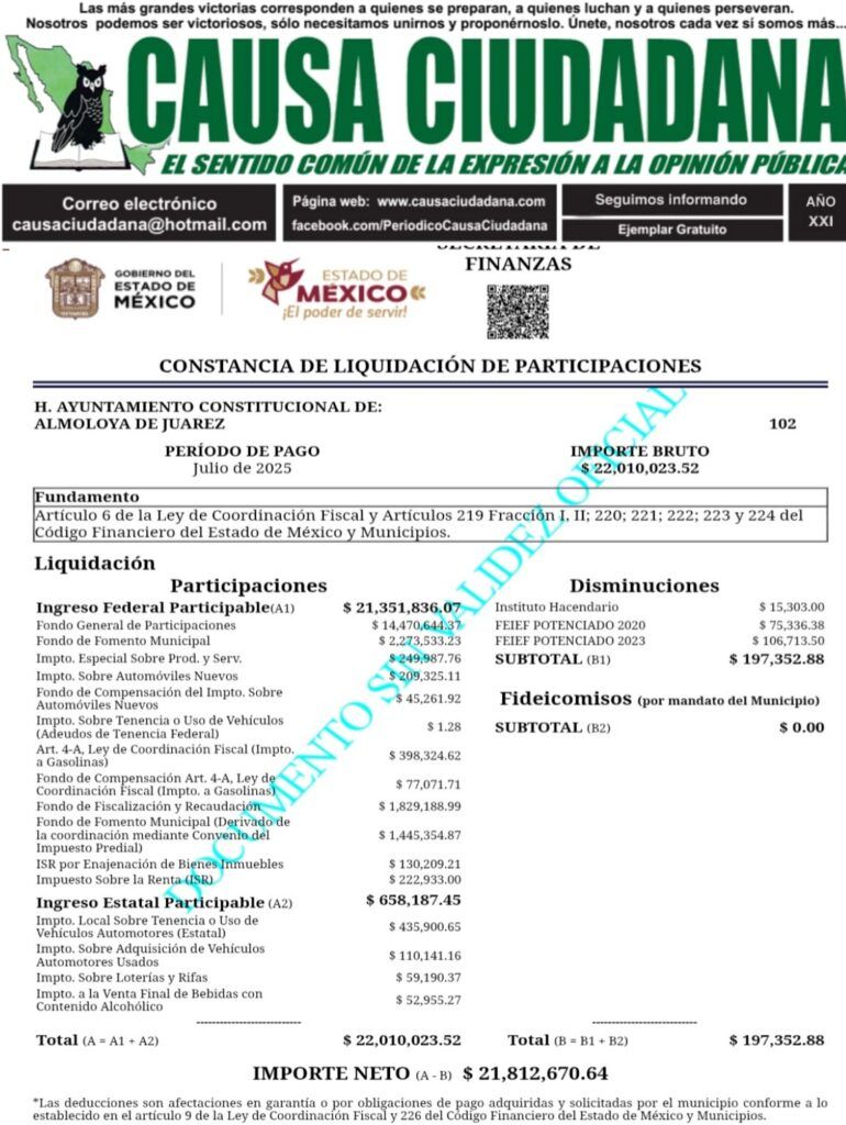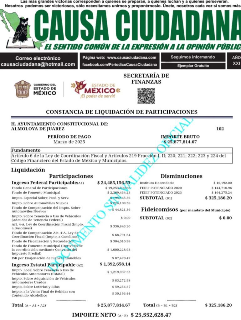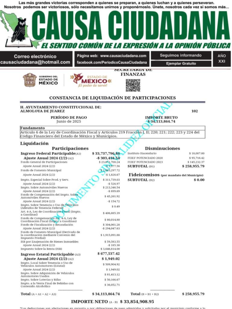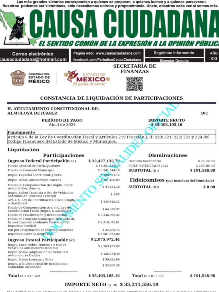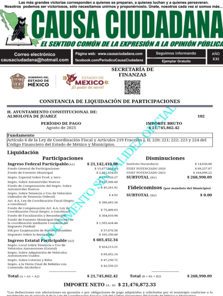 De acuerdo con registros oficiales de transferencias estatales y reportes públicos de finanzas del Estado de México, entre enero y noviembre el Ayuntamiento de Almoloya de Juárez recibió 290 millones 587 mil pesos provenientes del Gobierno del Estado, correspondientes a participaciones, aportaciones y fondos con destino específico.