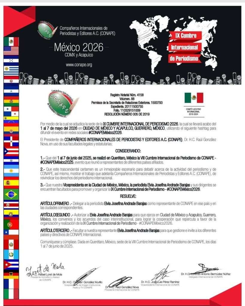 El presidente internacional de CONAPE (Compañeros Internacionales de Periodistas y Editores A.C.), el Dr. H.C. #RaúlGonzálezNova informa a todos los miembros, aliados y medios de comunicación que han iniciado formalmente los preparativos para IX Cumbre Internacional de Periodismo – #CONAPEMéxico2026, la cual se llevará a cabo del 1 al 8 de mayo de 2026 en la Ciudad de México, con ceremonia de clausura en #Acapulco, Guerrero, #México