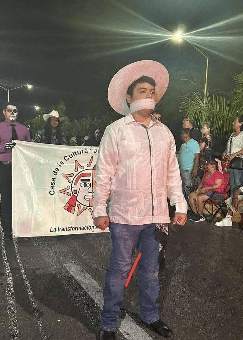 El gesto, lejos de pasar inadvertido, se convirtió en un acto simbólico de resistencia. En un evento pensado para celebrar la vida y la memoria, el joven recordó a los presentes que hay voces que la autoridad prefiere no escuchar. Su atuendo evocó el rostro y la causa del activista #CarlosManzo, quien en los últimos años ha denunciado censura, amenazas y hostigamiento por parte de estructuras políticas locales.