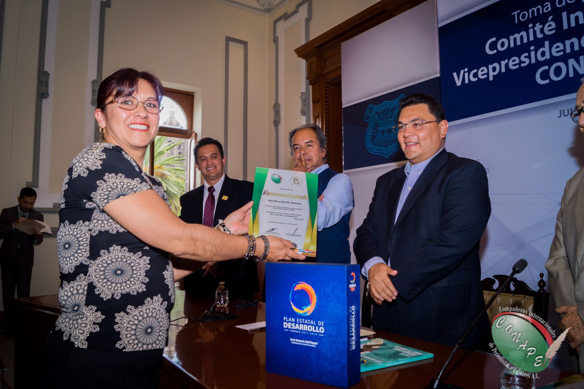 Puebla, Puebla, México.- En una magna ceremonia llevada a cabo en el Salón de Protocolos del Palacio Municipal de Puebla y ante la presencia del Presidente Internacional de Compañeros Internacionales de Periodistas y Editores A.C. (CONAPE), Lic. Raúl González Nova en compañía del director de Puebla Comunicaciones, Ricardo Gutiérrez Loyola, en representación del gobernador del estado Tony Gali, se llevó a cabo la toma de protesta de la Vicepresidencia de CONAPE en el estado de Puebla.