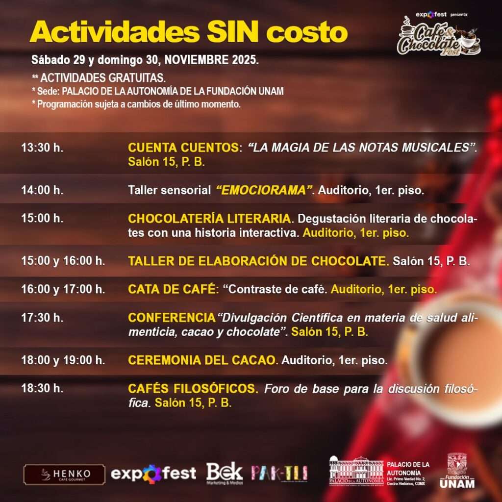 #EventosGratuitos #Navidad #cafemexicano #Chocolate #ProductosArtesanales #postresdeliciosos #ActividadesCulturalesGratuitas #diversionasegurada #UNAM #cultura #educación #gastronomía #CentroHistórico #CDMX #FundaciónUNAM #ExpoFest #BekMarketingyMedios