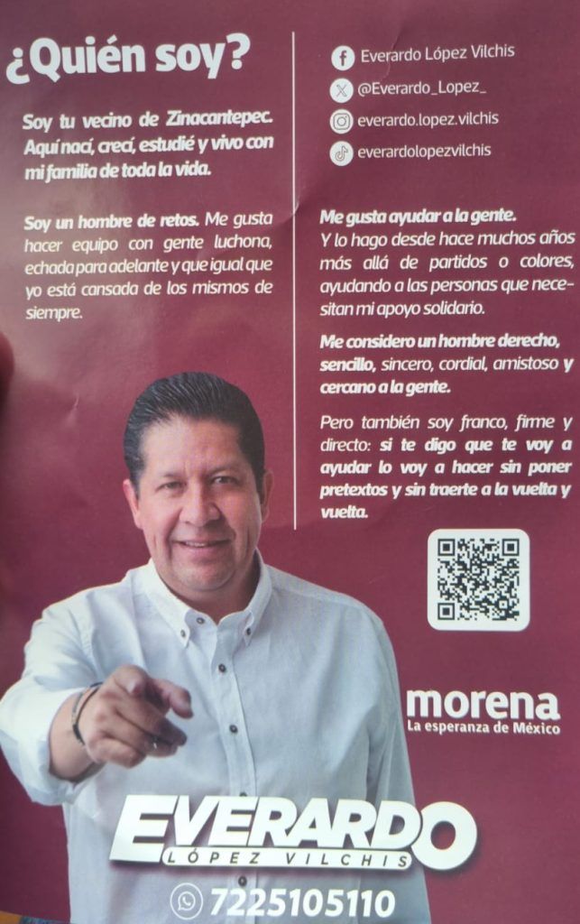 Zinacantepec, México. – El expanista, hoy morenista Everardo Lopez Vilchis, cae en la desesperación y al parecer incurre en actos anticipados de campaña que el mismo partido de #Morena puso, (1) NO colocar propaganda personalizada para promover mi imagen, (2) NO realizar eventos públicos en los que promueva su imagen (3) NO realizar gastos en redes sociales, pero al parecer todo esto al empresario se lo pasa por el arco del triunfó.