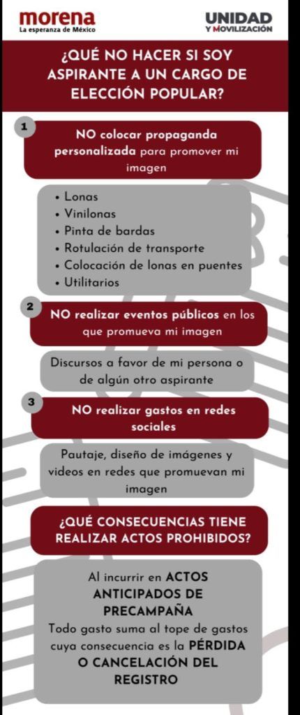 La ley es clara y dice en su artículo (3) de la ley general de Instituciones y procedimientos electorales, los actos anticipados de campaña se refieren a las. expresiones que se realicen, bajo cualquier modalidad y en cualquier momento, fuera de la etapa de campañas que contengan: llamados expresos al voto en contra o a favor de una candidatura o un partido y presiones en las que alguna candidatura o partido solicite cualquier tipo de apoyo para contender en el proceso electoral.