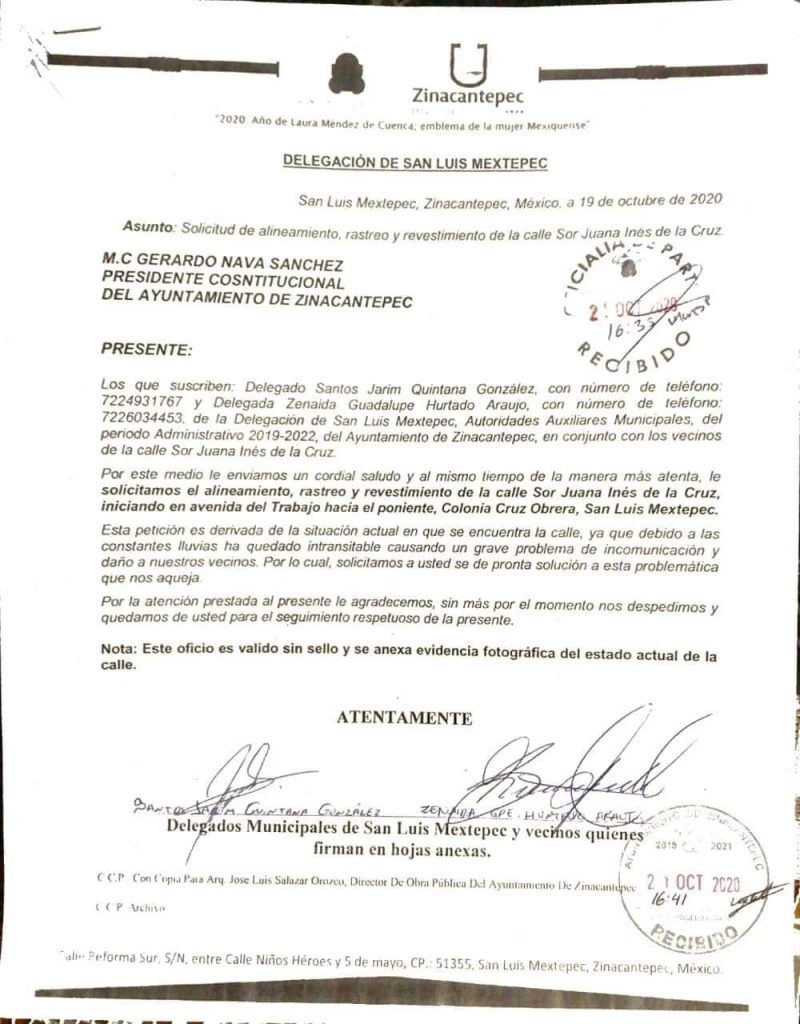Zinacantepec, Méx. – El doctor Gerardo Nava hace caso omiso a peticiones de los comuneros de San Luis Mextepec del municipio de la tierra del murciélago, los inconformes manifestaron a quien escribe que ya son varios los oficios que le han dirigido al presidente Nava Sánchez, le han hecho saber su inconformidad y molestias por la falta de apoyo por parte de su administración municipal.