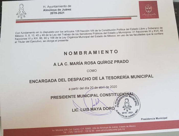 ALMOLOYA DE JUAREZ, MÉXICO. – #luismayadoro aún no sale de una bronca y se mete a otra más profunda, a partir del día 20 de abril nombro como encargada del despacho de tesorería municipal a la que dice que es Contadora Publica o Contadora Privada, porque sus documentos los firma como C. P. María Rosa Quiroz Prado.