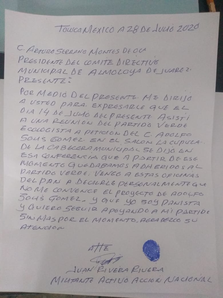 Juan Ribera quien desde el 4 de agosto del 2007, hay pertenecido a las filas de Acción Nacional y es quien tiene más a los dentro del Panismo en Almoloya de Juárez, hoy abandona al Verde Ecologista y regresa a la que siempre ha sido su casa al PAN, por la sencilla razón que Adolfo Solís los engaño.