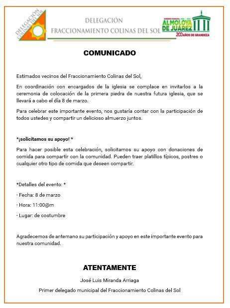 En el Fraccionamiento Colinas del Sol en #AlmoloyaDeJuarez , se anunció con bombo y platillo la colocación de la primera piedra de una futura iglesia, programada para el próximo 8 de marzo. La invitación fue difundida por el primer delegado municipal, #JoséLuisMirandaArriaga quien convoca a los vecinos a participar en la ceremonia y, de paso, a llevar comida para un almuerzo comunitario.