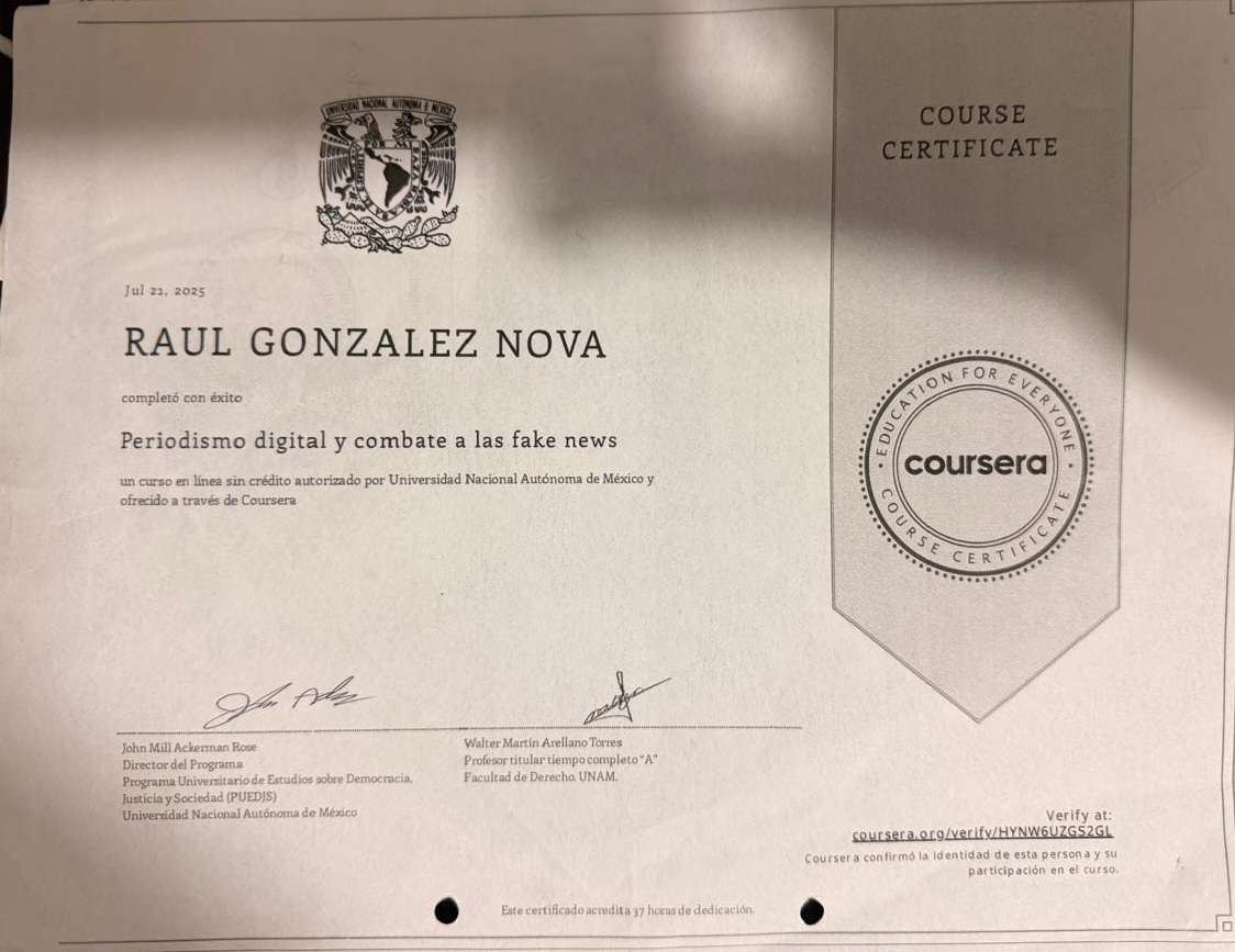 Tul, 23 de 2025 – Consciente de la importancia de la información verificada en la era digital, Raúl González Nova ha completado con éxito el curso en línea “Periodismo digital y combate a las fake news”, ofrecido por Coursera y avalado por la Universidad Nacional Autónoma de México (UNAM). Durante 37 horas de dedicación, Raúl adquirió herramientas clave para identificar noticias falsas, analizar fuentes confiables y comunicar información de manera responsable.