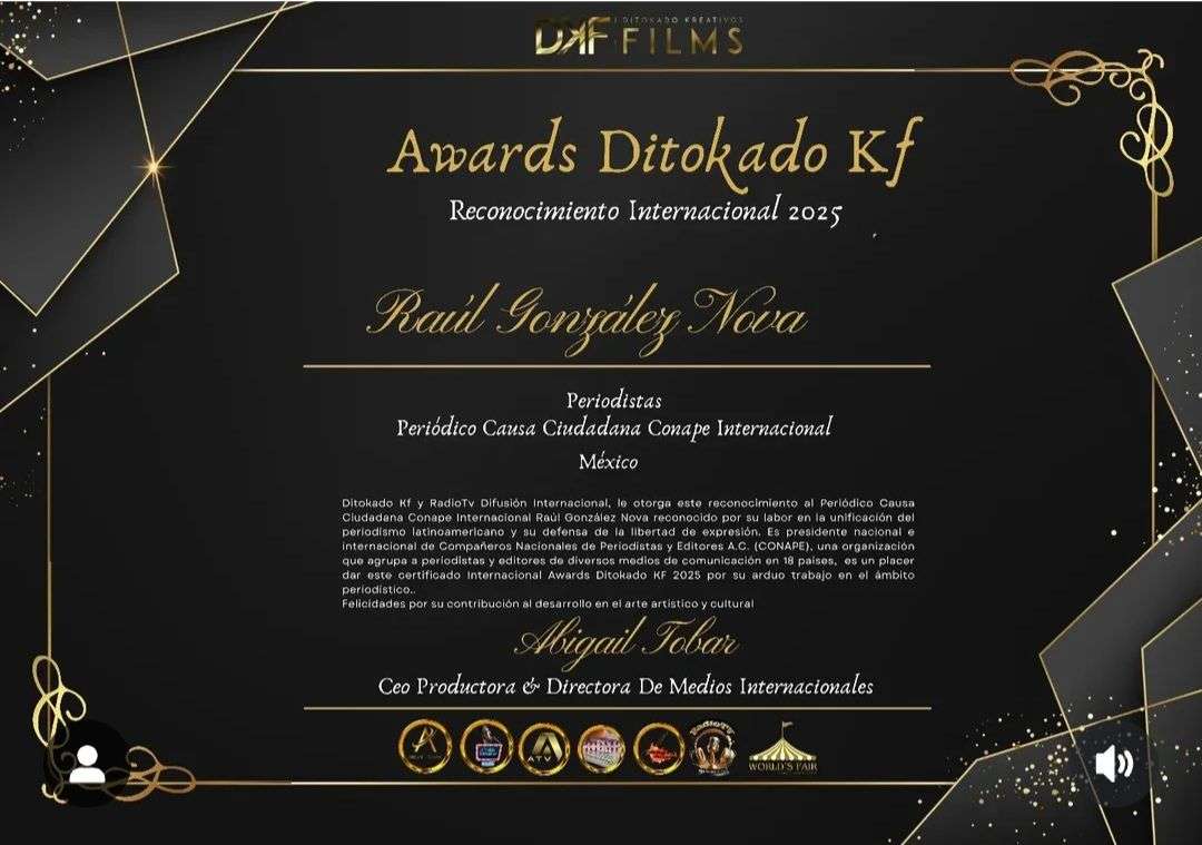 El Reconocimiento Internacional 2025, otorgado por Awards Ditokado KF, ha sido entregado a Raúl González Nova en honor a su incansable labor en la unificación del periodismo latinoamericano y su firme defensa de la libertad de expresión.