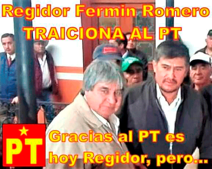 Lo que nunca pensó Fermín Romero es que todo lo que comienza, termina, y su MINITA DE ORO está a punto de acabársele y como en el PT ya ve difícil que Luis Antonio Guadarrama le de otro chancecito, porque nunca supo responder a la confianza que este le confirió, ni a la poca militancia Petista, hoy se va a Movimiento Ciudadano con la esperanza de $$$$$$$$$eguir cobrando el dineral que hoy se lleva de regidor, ó a MORENA? salió TRAIDOR este regidor que nada más se la pasa cobrando sin hacer absolutamente nada en su comisión de ALUMBRADO PUBLICO.