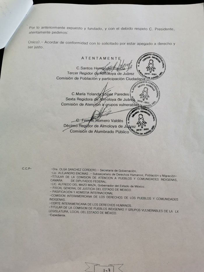 En un escrito realizado por los regidores Santos Hernández García y María Yolanda López Paredes de #MORENA, Fermín Romero Valdés del #PT, expusieron la situación que ha provocado en varias ocasiones el edil Luis Maya Doro, derivado de la imposición a conveniencia de algunos actores dentro del propio movimiento, consideramos urgente, la intervención de los ya mencionados, para poner un alto y erradicar los vicios del poder público acentuados los últimos 20 años en Almoloya de Juárez, agravados, hoy en día por el gobierno municipal de #MORENA que representa Luis Maya Doro presidente municipal 2019-2021.