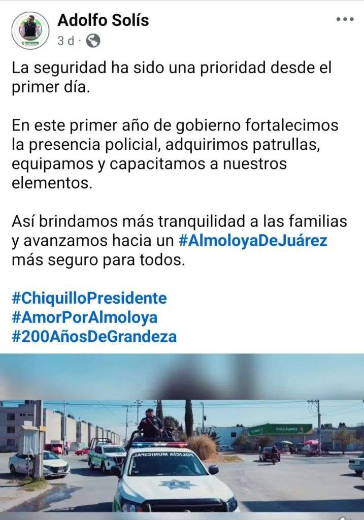 Desde el micrófono oficial, el presidente municipal de Almoloya de Juárez, Adolfo Solís Gómez, insiste en que “todo está bien”, que “la inseguridad ha bajado” y que “no existe corrupción en la Policía Municipal”.